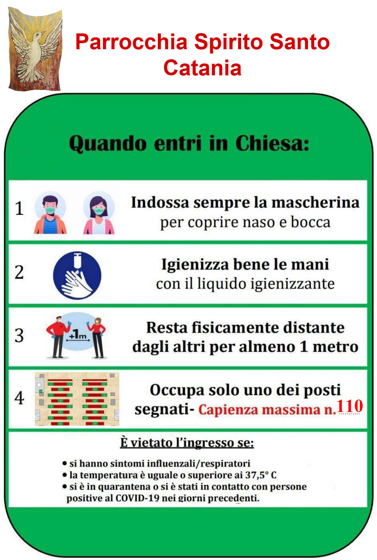 - In chiesa possono essere presenti al massimo 110 persone compreso il Celebrante e un solo Ministro Straordinario per la distribuzione dell'Eucarestia.
