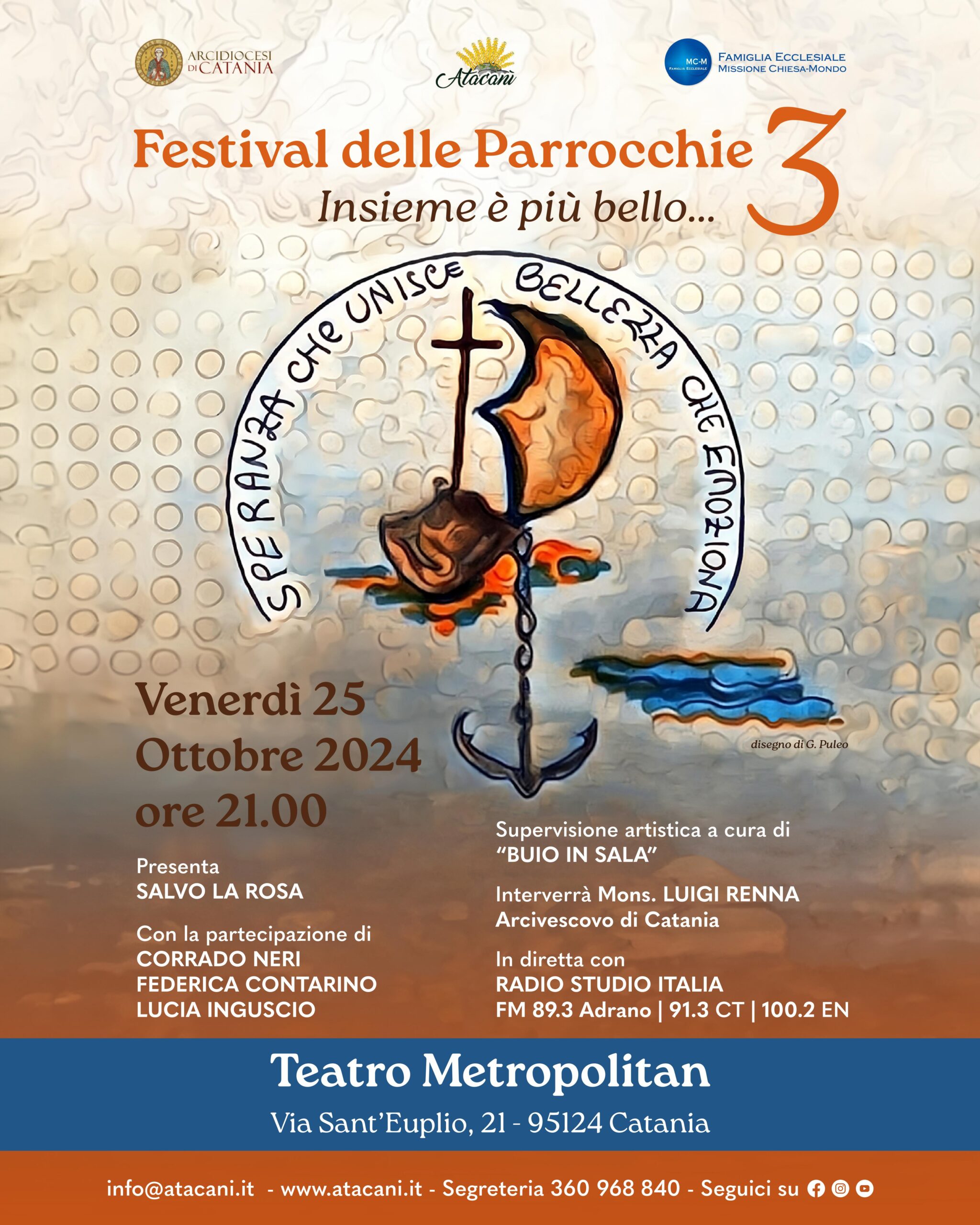 Il 3 Festival delle Parrocchie si svolgerà presso il teatro Metropolitan (via Sant'Euplio, 21 - Catania) il giorno 25 ottobre 2024 con inizio alle ore 21:00.